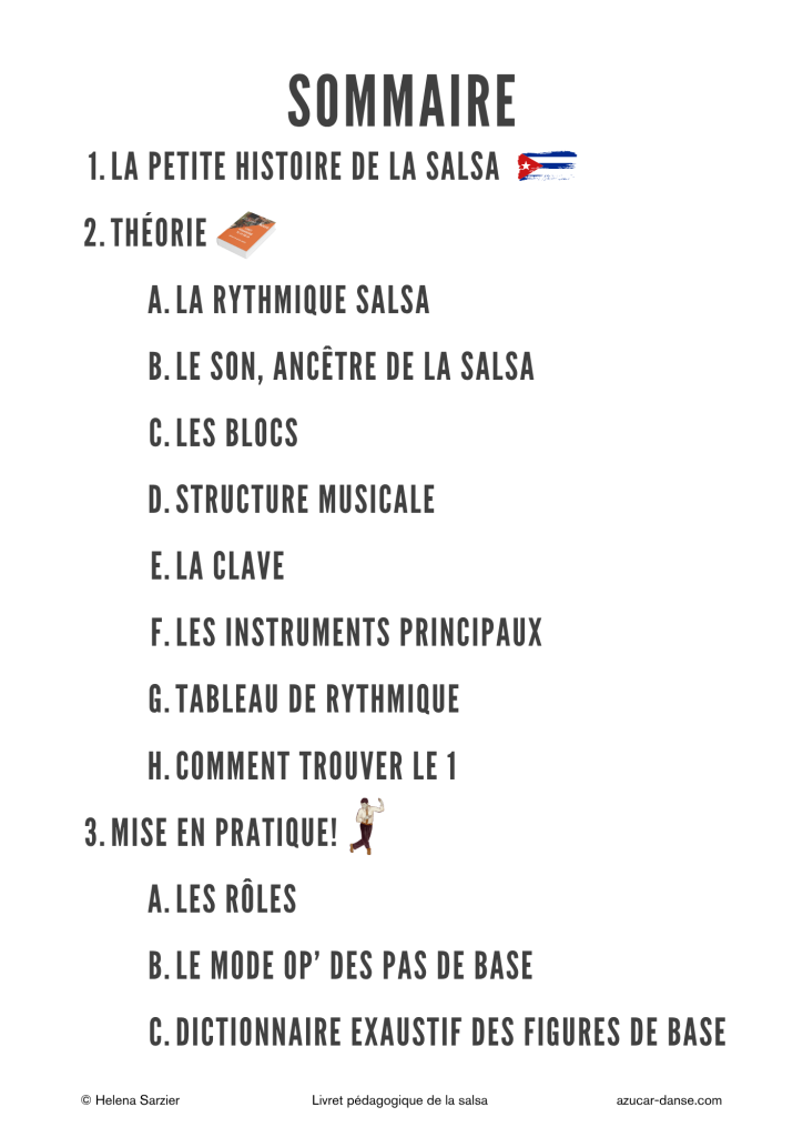 Dans ce livret , vous trouverez des résumés schématisés et vulgarisés sur différentes thématiques autour de la salsa qui vous permettront de mieux vous repérer pendant votre apprentissage. C’est un excellent outil en complément de vos cours collectifs ou particuliers.